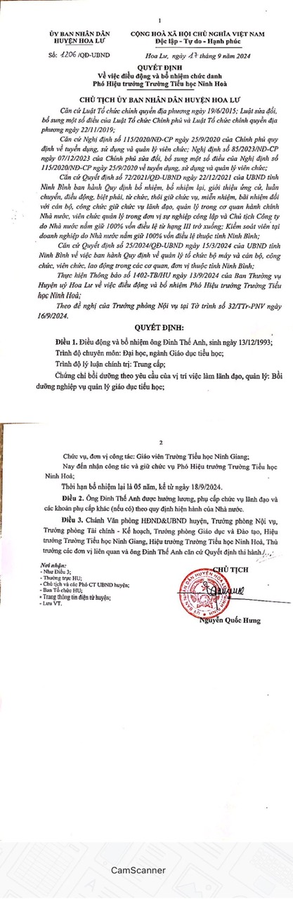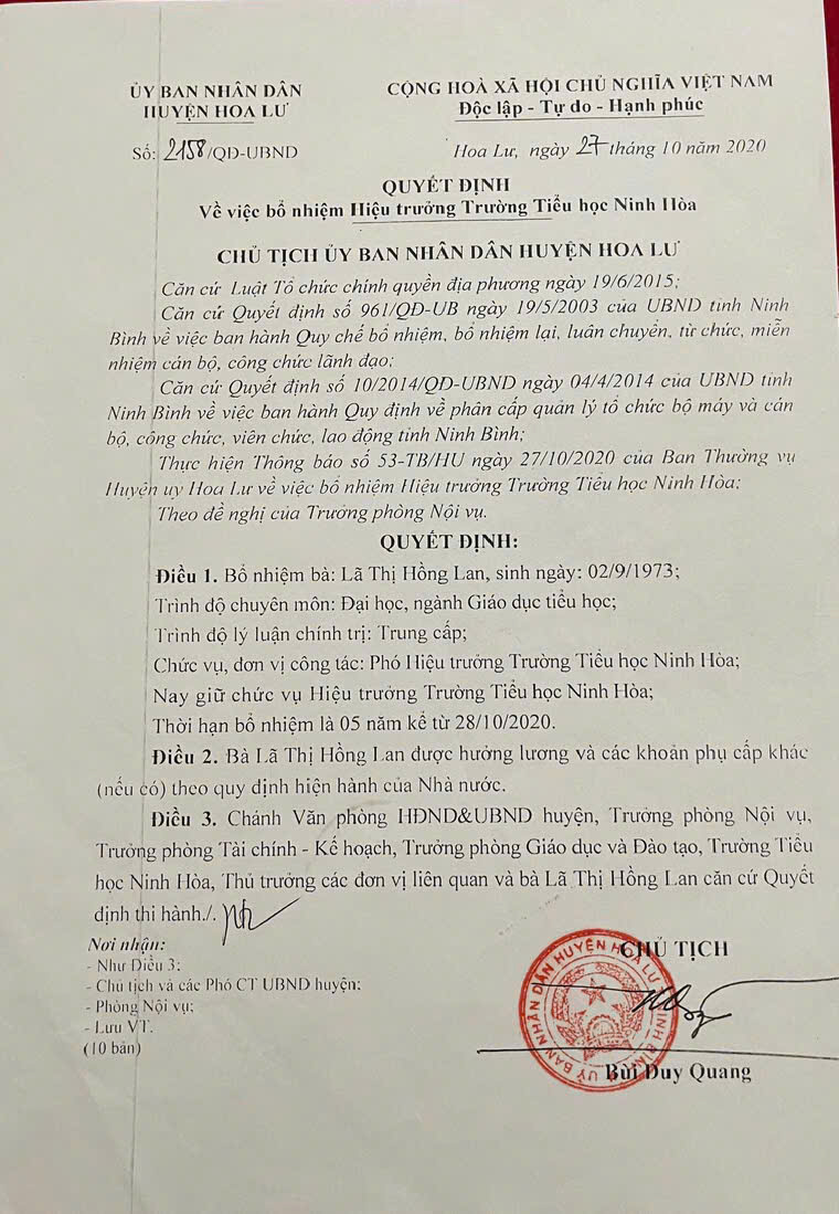 Quyết định bổ nhiệm hiệu trưởng, hiệu phó trường tiểu học Ninh Hòa (có file đính kèm)