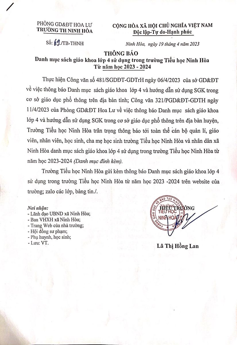 – Hiệu trưởng Trường tiểu học Ninh Hòa ra thông báo số 69/TB-THNH về Danh mục SGK lớp 4 sử dụng trong Trường tiểu học Ninh Hòa năm học 2023 – 2024.