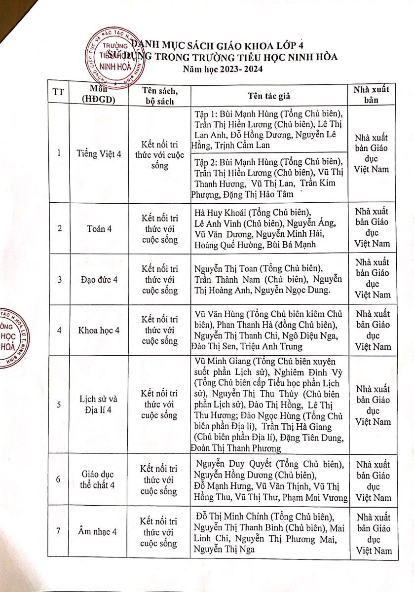 Thông báo Danh mục SGK lớp 4 sử dụng trong Trường tiểu học Ninh Hòa năm học 2023 – 2024.