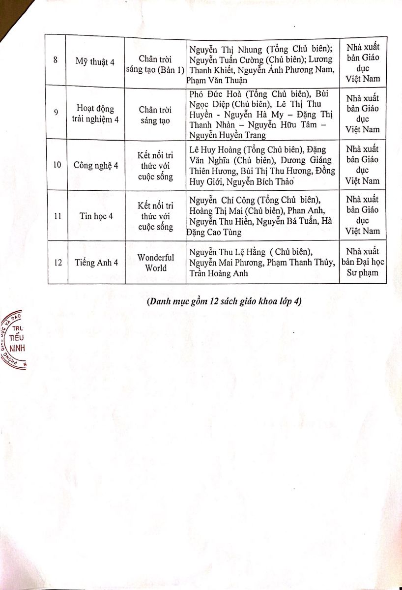 – Căn cứ Quyết định số 204/QĐ-UBND của UBND tỉnh Ninh Bình về Quyết định phê duyệt Danh mục sách giáo khoa lớp 4, lớp 8, lớp 11 và môn Lịch sử lớp 10 sử dụng trong cơ sở giáo dục phổ thông trên địa bàn tỉnh Ninh Bình từ năm học 2023- 2024.