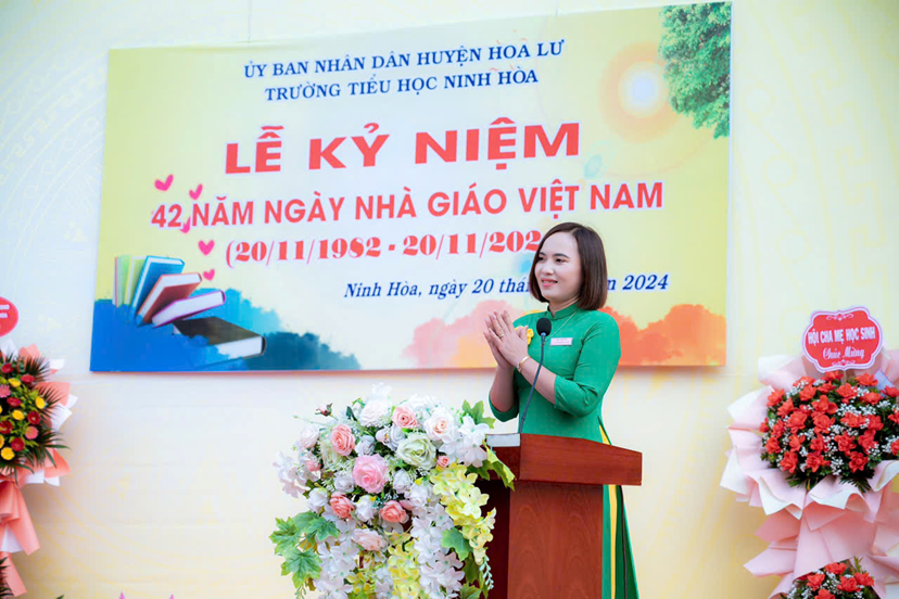 Tiếp đó, cô Lã Thị Hồng Lan, Hiệu trưởng nhà trường, đã xúc động đọc bài diễn văn ôn lại truyền thống Ngày Nhà giáo Việt Nam. Trong bài phát biểu, cô nhấn mạnh vai trò của thầy cô trong sự nghiệp giáo dục và gửi lời tri ân sâu sắc đến toàn thể đội ngũ giáo viên.