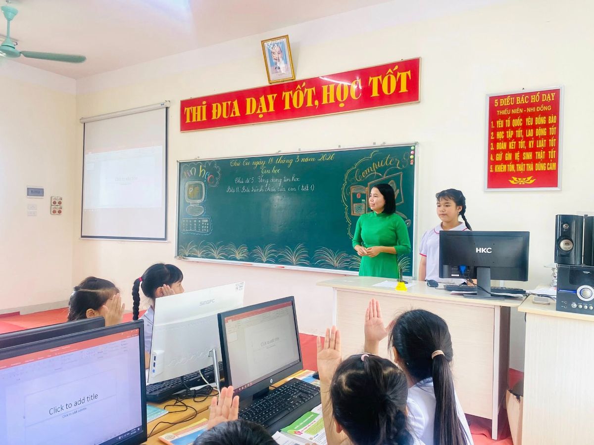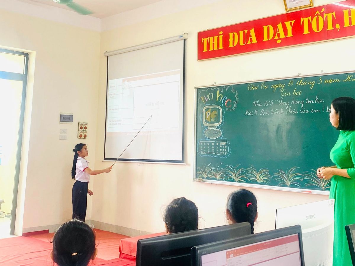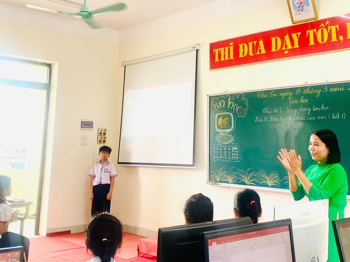 Các thầy cô dự tiết dạy chuyên đề môn Tin học lớp 3 “Bài 11: Bài trình chiếu của em (Tiết 1)” do cô giáo Phạm Thị Ngoan cùng học sinh lớp 3D thực hiện. Trong giờ học, giáo viên đã tổ chức các hoạt động học tập phù hợp, sáng tạo; học sinh hứng thú tham gia học tập, phát huy tính tích cực, chủ động. Đặc biệt, tiết dạy đã thể hiện rõ việc ứng dụng công nghệ trong học tập, góp phần nâng cao năng lực số và kỹ năng công dân số cho học sinh.
