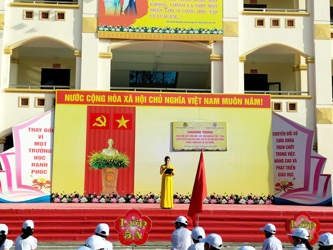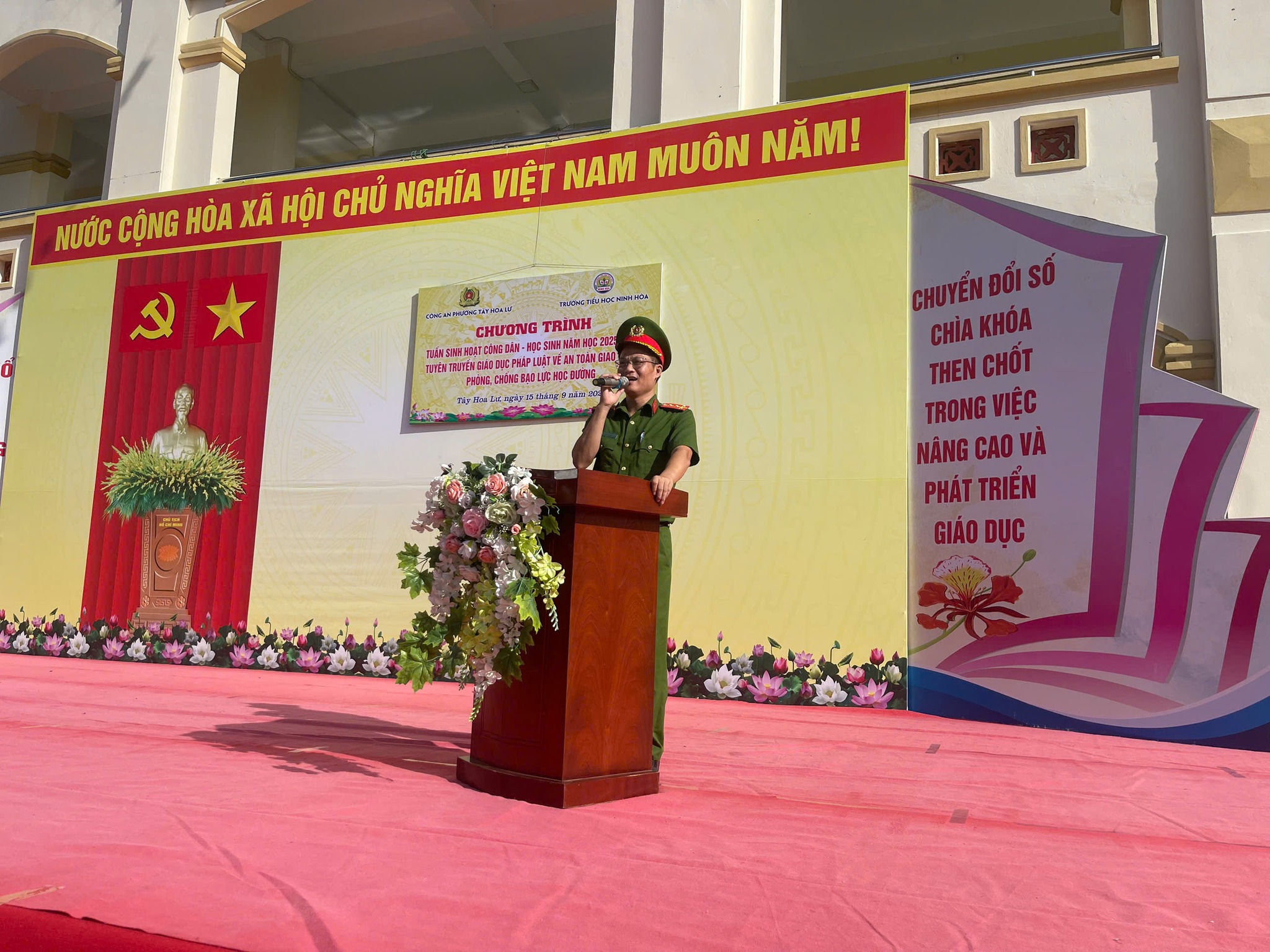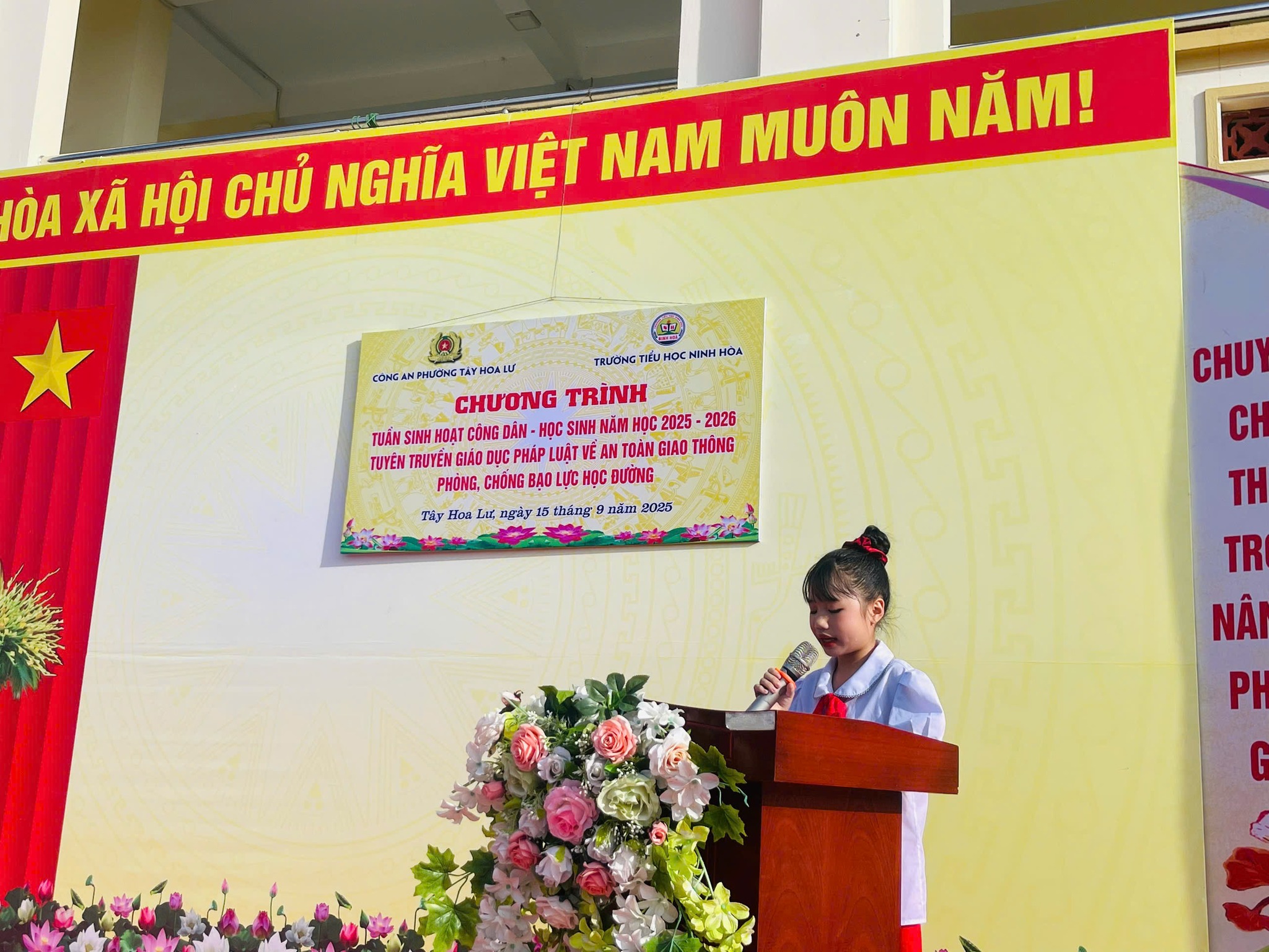 Thực hiện kế hoạch năm học, trong khuôn khổ “Tuần sinh hoạt công dân – học sinh năm học 2025 – 2026”, sáng ngày 15 tháng 9 năm 2025, trường Tiểu học Ninh Hòa đã phối hợp chặt chẽ với Công an phường Tây Hoa Lư tổ chức buổi tuyên truyền, giáo dục pháp luật và kỹ năng an toàn cơ bản, thiết thực cho toàn thể học sinh nhà trường.