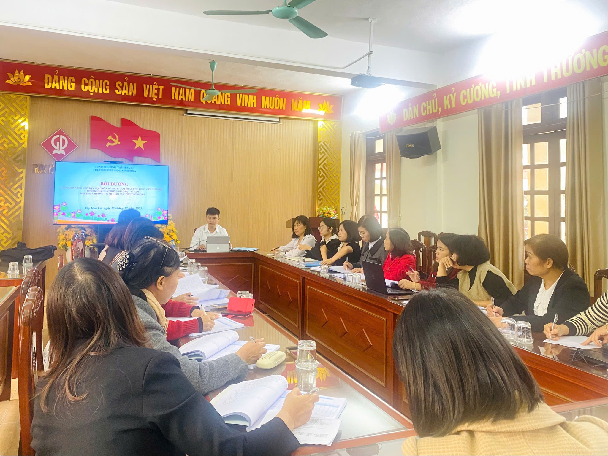 Thực hiện kế hoạch chuyên môn năm học 2025 – 2026 và nhằm không ngừng đổi mới, nâng cao chất lượng giảng dạy, ngày 15 tháng 12 năm 2025, trường Tiểu học Ninh Hòa đã tổ chức buổi bồi dưỡng chuyên môn với chủ đề “Nâng cao năng lực dạy học môn Mĩ thuật, Âm nhạc cho giáo viên tiểu học thông qua hoạt động giáo dục STEAM, đáp ứng Chương trình Giáo dục phổ thông 2018”.