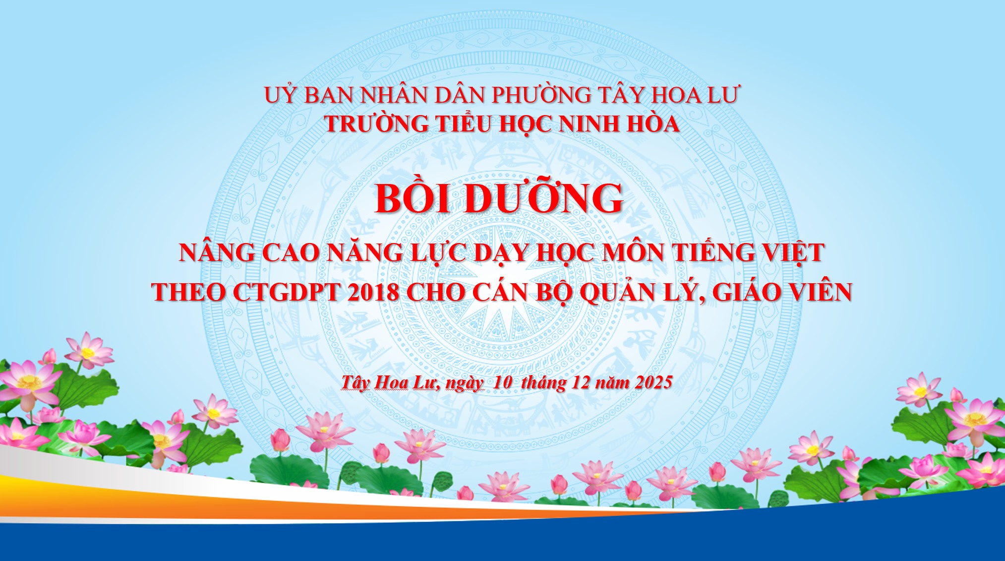 Thực hiện kế hoạch chuyên môn năm học 2025 – 2026, với mục tiêu không ngừng nâng cao chất lượng đội ngũ và hiệu quả giảng dạy, ngày 10 tháng 12 năm 2025, trường Tiểu học Ninh Hòa đã tổ chức thành công lớp Bồi dưỡng nâng cao năng lực dạy học môn Tiếng Việt theo Chương trình Giáo dục phổ thông 2018 cho toàn thể cán bộ quản lý và giáo viên nhà trường.